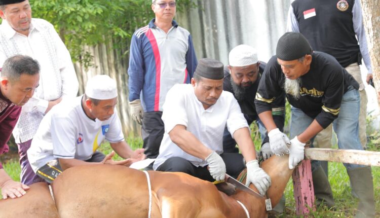 Di bawah bimbingan Juru Sembelih Halal (Juleha) Provinsi Kepulauan Bangka Belitung, Plh Pj Gubernur Babel, Fery Afriyanto menyembelih sapi kurban dengan tata cara penyembelihan hewan kurban.