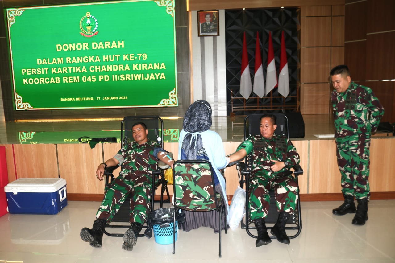 Pangkalpinang – Korem 045/Gaya gelar donor darah dalam rangka HUT Ke-79 Persit Kartika Chandra Kirana Koorcab Rem 045 PD ll/Sriwijaya tempat Aula Makorem 045/Gaya, Jumat (17/01/2025)