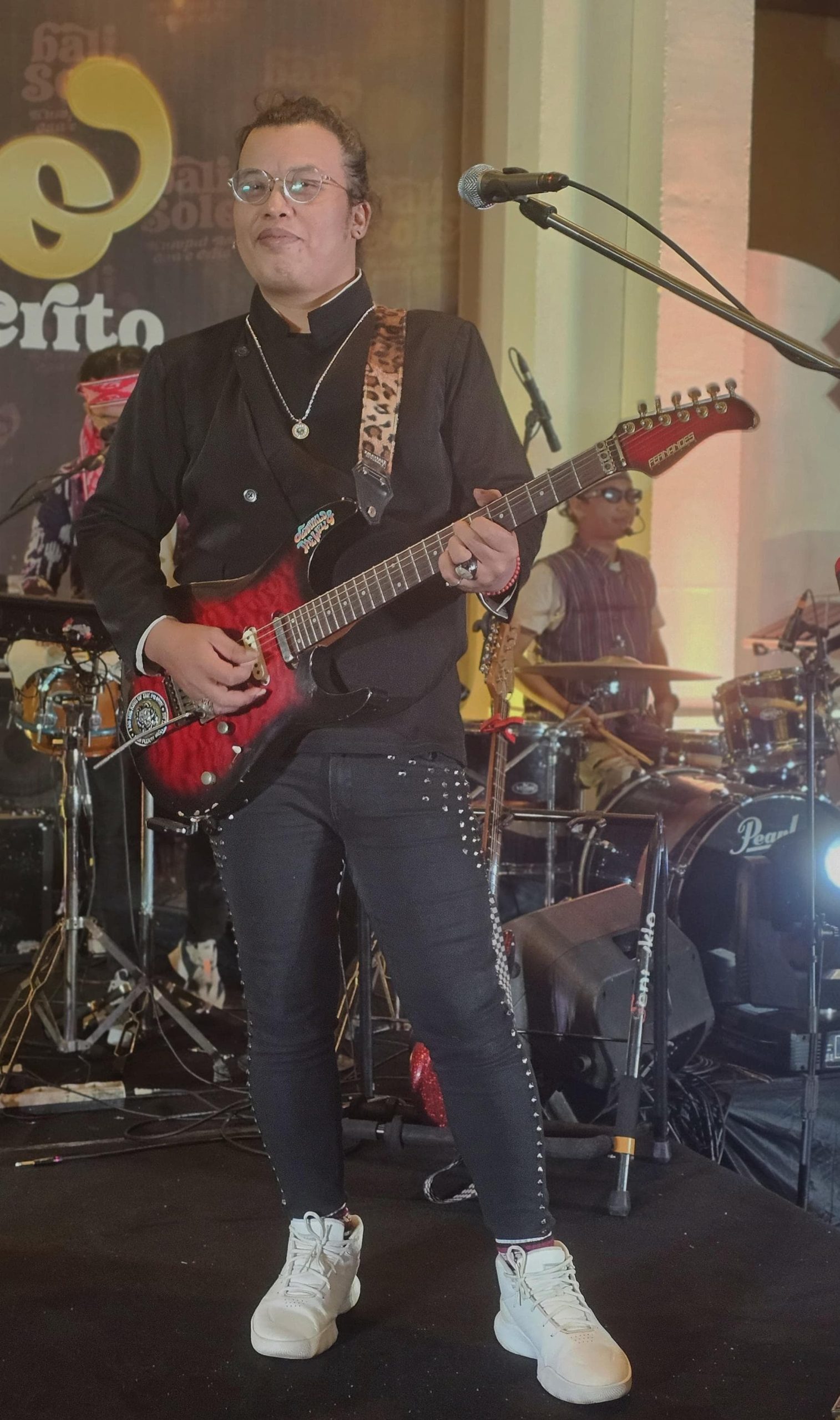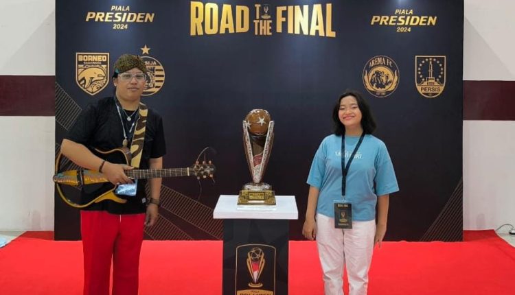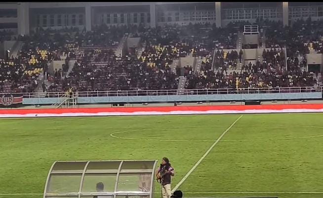 BABELTODAY.COM, SURAKARTA – Salah seorang anggota Setya Kita Pancasila (SKP) Kota Surakarta (Solo) Denny Kusuma Klow menjadi gitaris musik di Stadion Manahan Solo, saat pertandingan perebutan juara 3 Persis Solo melawan Persija Jakarta, Sabtu (3/8/2024). Dimana laga ini dimenangkan Persis Solo pada Piala Presiden Joko Widodo (Jokowi) 2024 dengan skor 0 – 1.