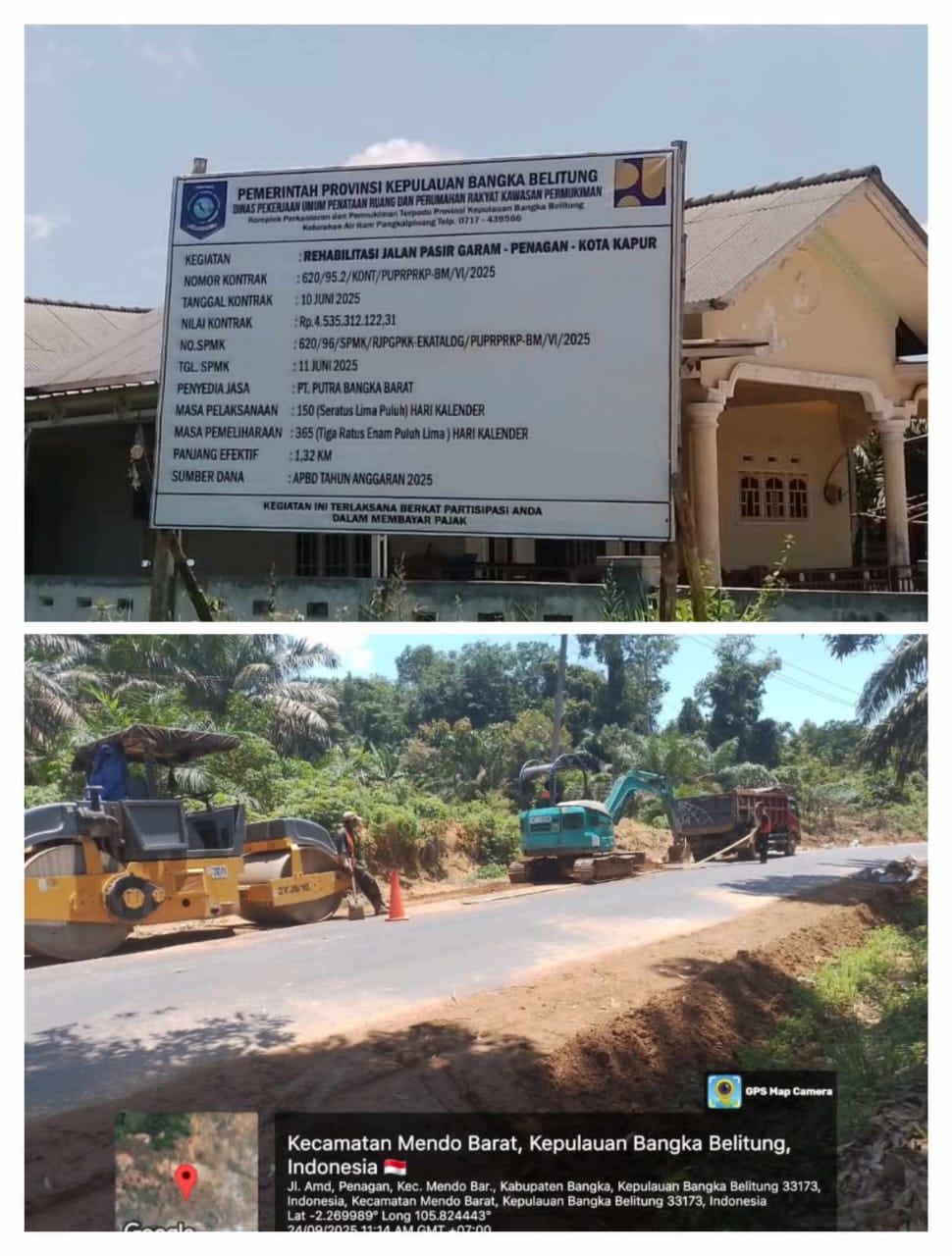 Babeltoday.com, Mendo Barat (Bangka) — Proyek rehabilitasi Jalan Pasir Garam–Penagan–Kota Kapur, yang dibiayai dari APBD Provinsi Kepulauan Bangka Belitung Tahun Anggaran 2025 dengan nilai kontrak mencapai Rp4,5 miliar, kini menjadi sorotan. Meski papan proyek terpampang jelas di pinggir jalan, hasil penelusuran awak media di lapangan mengungkap sejumlah dugaan kejanggalan dalam pelaksanaan pekerjaan. Minggu (5/10/2025).