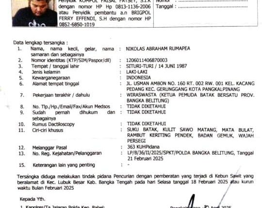 Penetapan tersebut tertuang dalam surat DPO Nomor: DPO/10/IV/Res.1.8./2025/Ditreskrimum tertanggal 30 April 2025. Dalam surat yang ditandatangani oleh penyidik Polda Babel, Nikolas diduga terlibat dalam aksi pencurian sawit yang terjadi pada Selasa, 18 Februari 2025, di sebuah kebun sawit yang berlokasi di Kecamatan Lubuk Besar, Kabupaten Bangka Tengah.