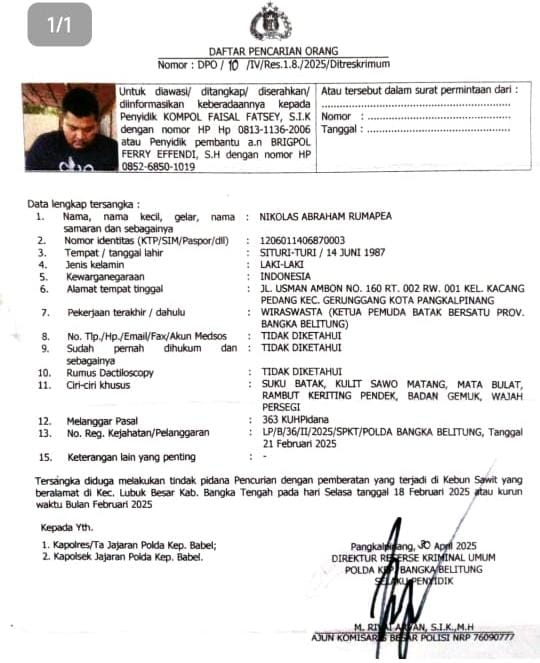 Babeltoday.com, Pangkalpinang – Kepolisian Daerah Kepulauan Bangka Belitung resmi menetapkan Nikolas Abraham Rumapea, Ketua Pemuda Batak Bersatu (PBB) Provinsi Kepulauan Bangka Belitung, sebagai Daftar Pencarian Orang (DPO) dalam kasus dugaan tindak pidana pencurian dengan pemberatan di Kebun Sawit. Selasa (27/5/2025).