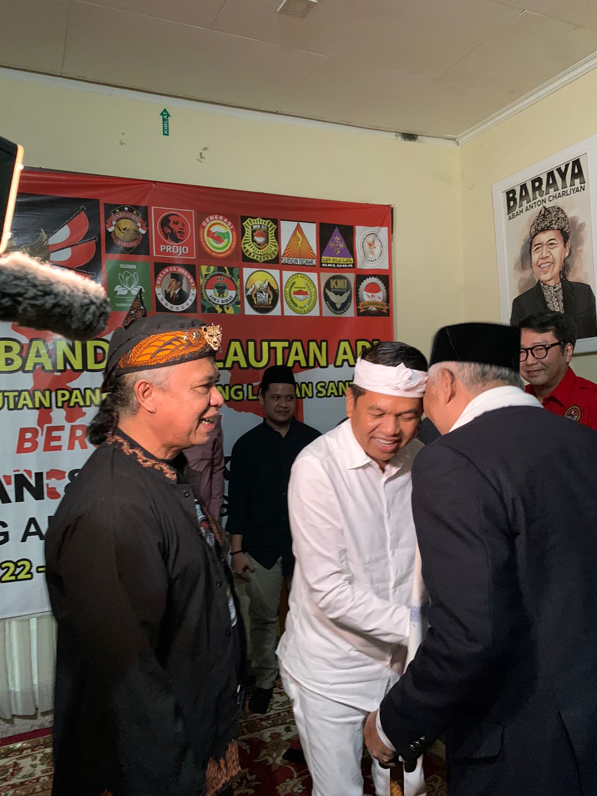 Abah Anton, yang dikenal sebagai mantan Kapolda Jabar dan salah satu sesepuh Jawa Barat, menyambut Kang Demul, tokoh budaya yang juga anggota DPR RI terpilih dari Partai Gerindra, dengan penuh keakraban.