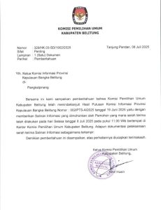 Melalui surat resmi bernomor 329/HK 03-SD/1902/2025 yang bersifat penting dan bertanggal 8 Juli 2025, KPU Kabupaten Belitung menyampaikan pemberitahuan kepada Ketua KI Provinsi Babel bahwa pihaknya telah melaksanakan putusan sidang KI Nomor 002/PTS-A/2025 tertanggal 19 Juni 2025.
