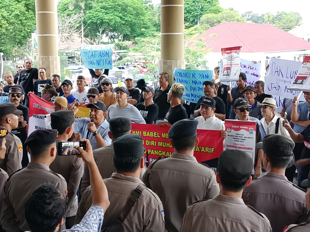 BABELTODAY.COM, Pangkalpinang – Puluhan warga Pangkalpinang yang tergabung dalam Kesatuan Aksi Harapan Masyarakat Indonesia (KAHMI) menggelar aksi damai di depan Kantor Walikota Pangkalpinang, Jumat siang (25/10/2024). Mereka mendesak Penjabat (Pj) Walikota Pangkalpinang, Budi Utama, untuk menindak Aparatur Sipil Negara (ASN) di lingkungan Pemkot Pangkalpinang yang terindikasi melanggar prinsip netralitas dengan mendukung pasangan calon (Paslon) nomor urut 2, Molen–dr. Hakim. Sabtu (26/10/2024).