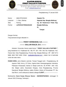Ketua Ormas Forum P3B dilaporkan oleh Kantor Hukum Ferdy Gallan & Partners ke Kapolda Kep Babel lantaran disinyalir melakukan tindak pidana tentang Pencemaran Nama Baik, Fitnah, dan Upaya Pemerasan.