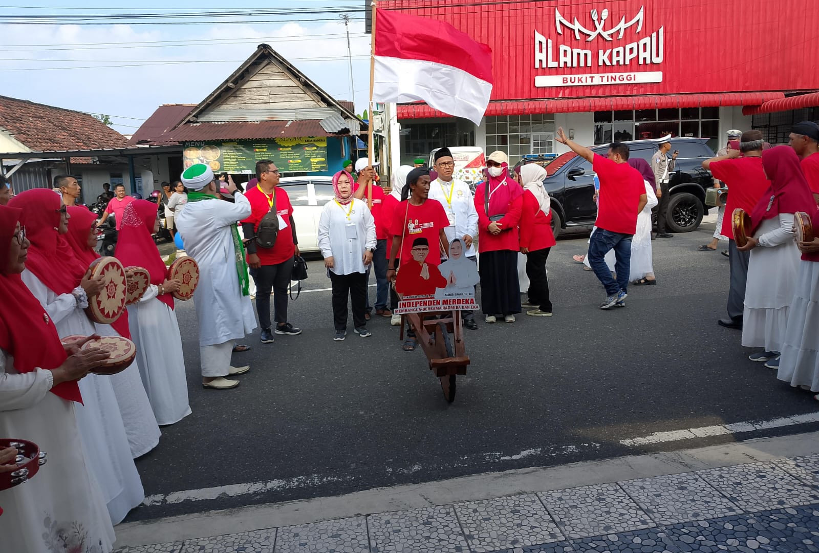 Tak hanya itu, suasana religius turut menyertai prosesi pendaftaran. Rebana dan shalawat nabi bergema di pelataran kantor KPU, dinyanyikan para relawan dan simpatisan sebagai bentuk dukungan moral dan spiritual bagi pasangan MERDEKA. Ini bukan sekadar pertunjukan—ini adalah pernyataan sikap.