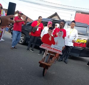 Babeltoday.com, Pangkalpinang — Suasana di sekitar Kantor Komisi Pemilihan Umum (KPU) Kota Pangkalpinang, Kamis sore (26/6/2025), mendadak ramai dan semarak. Bukan oleh iring-iringan kendaraan elite atau parade mewah penuh bendera partai, melainkan oleh suara tabuhan drumband dari kaleng bekas dan sorak-sorai massa rakyat yang membawa bendera bertuliskan “MERDEKA”—akronim dari Membangun bersama Ramida Dawam dan Eka Putra Mulya.