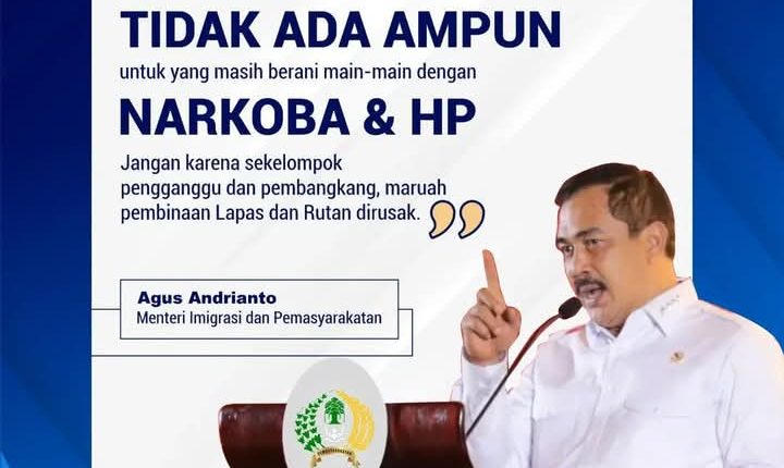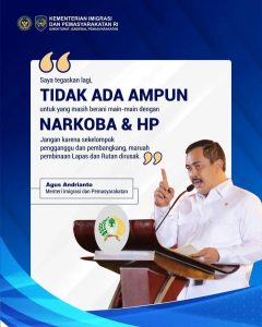 Caption: Pernyataan Menteri Imigrasi dan Pemasyarakatan, Agus Andrianto : “Saya tegaskan, tidak ada ampun bagi siapa pun yang masih berani bermain-main dengan narkoba, apalagi di dalam lingkungan lembaga pemasyarakatan dan rumah tahanan. Kita tidak akan mentoleransi segala bentuk pelanggaran yang mencederai komitmen kita dalam menjalankan sistem pemasyarakatan yang bersih dan berintegritas.”