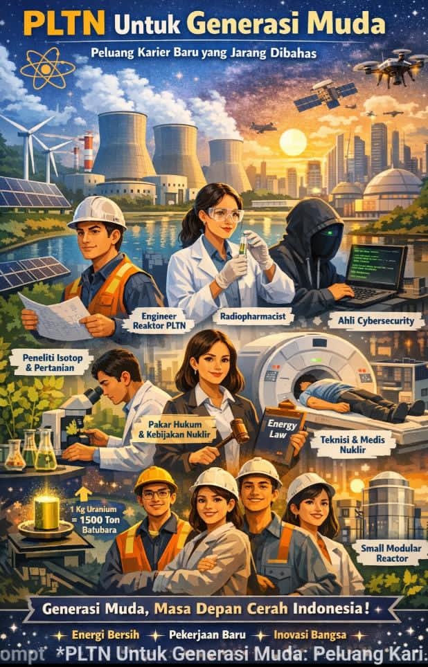 Jika negara lain menjadikan teknologi nuklir sebagai pintu karier masa depan—dari insinyur, fisikawan medis, ahli hukum energi, teknisi radiofarmaka, perencana kebijakan, cybersecurity nuklir, hingga analis keselamatan radiasi—mengapa kita hanya sibuk memperdebatkan bahaya?