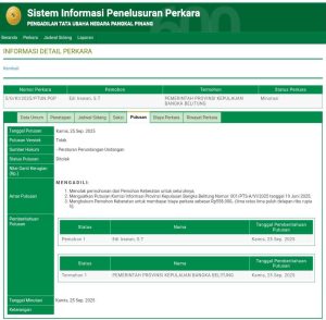 Pengadilan Tata Usaha Negara (PTUN) Pangkalpinang menolak permohonan keberatan yang diajukan oleh Edi Irawan terhadap Pemerintah Provinsi Kepulauan Bangka Belitung.