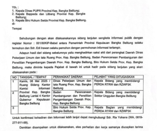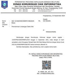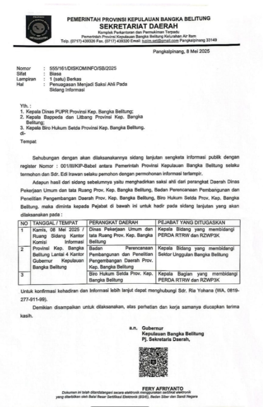 Babeltoday.com, Pangkalpinang — Dua surat resmi Pemerintah Provinsi Kepulauan Bangka Belitung, masing-masing ditandatangani Plt. Kepala Dinas Kominfo dan Pj. Sekda Babel, Fery Afriyanto, menunjukkan adanya penugasan pejabat teknis untuk hadir sebagai saksi ahli dalam sidang sengketa informasi publik. Namun, fakta di ruang sidang berbalik. Nama-nama yang tertera dalam surat justru membuat pernyataan di bawah sumpah bukan sebagai saksi ahli, melainkan hanya saksi biasa. Rabu (24/9/2025).