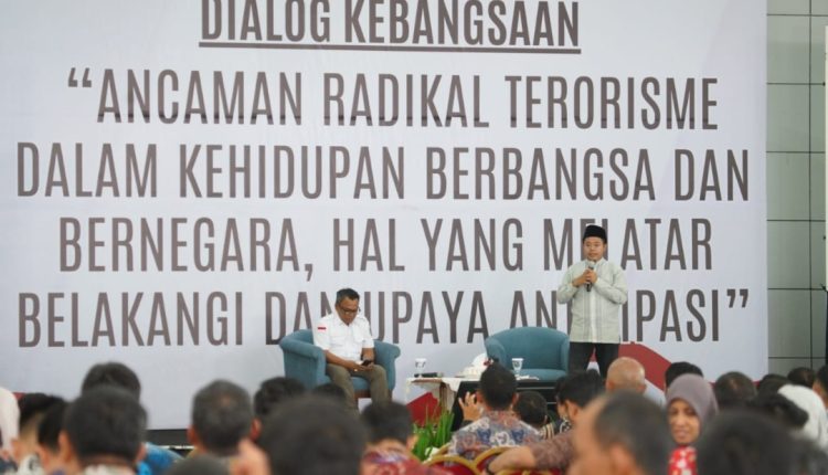 Dialog Kebangsaan ini menghadirkan narasumber Direktur Eksekutif Jaringan Moderat Indonesia Islah Bahrawi dan Sekretaris Badan Penanggulangan Ekstremisme dan Terorisme MUI M. Najih Arromadloni
