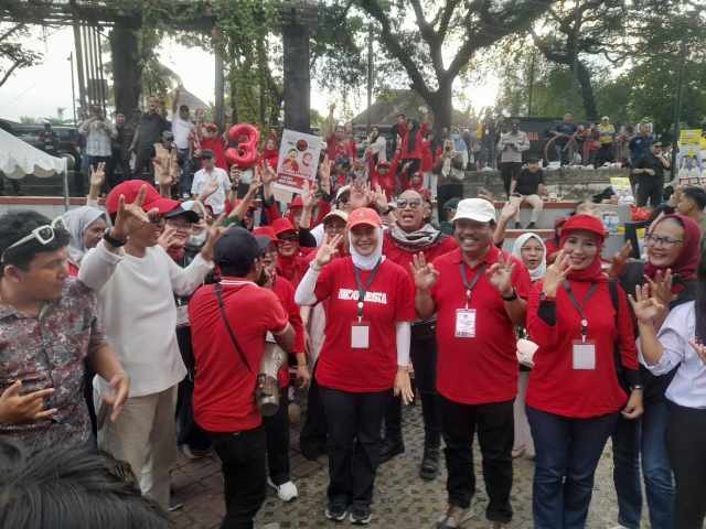 Teriakan penuh semangat, “Nomor 3 Menang!” menggema dari setiap sudut taman. Para pendukung yang mengenakan pakaian merah kompak menyambut kedatangan pasangan Udin–Dessy dengan lagu-lagu perjuangan, genderang semangat, dan yel-yel kemenangan.