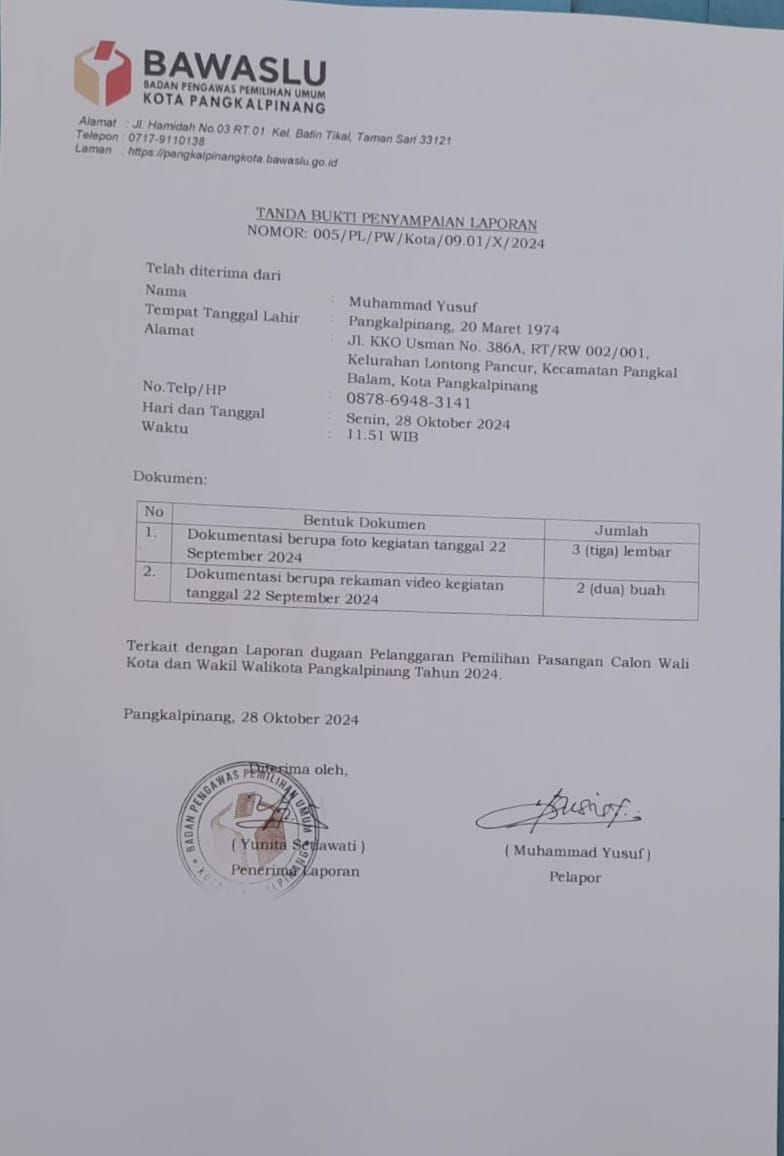Bang Jojo menambahkan bahwa bukti laporan telah disampaikan kepada Pj Walikota Pangkalpinang.